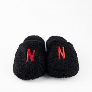 • Uma pantufa preta bordada com o “N” vermelho;