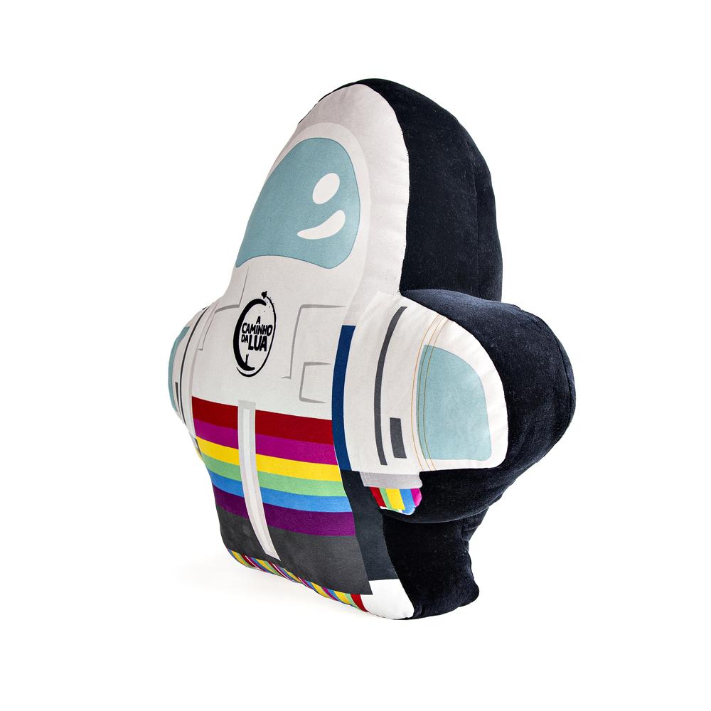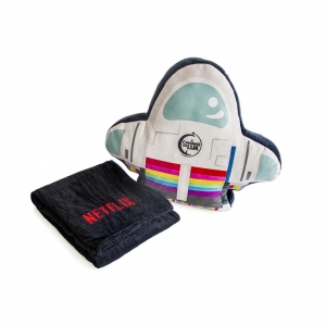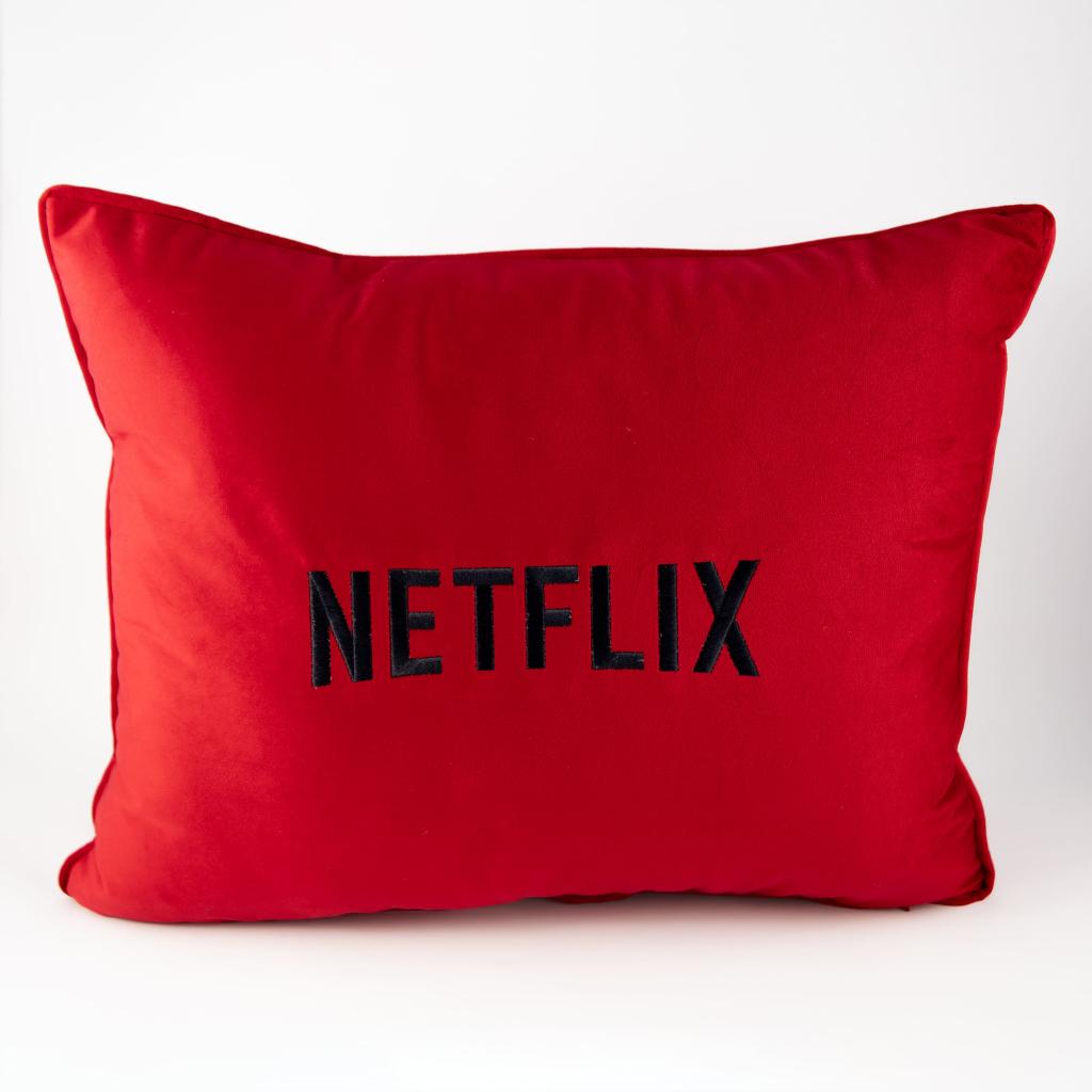 • Uma almofada vermelha com bordado preto escrito NETFLIX;