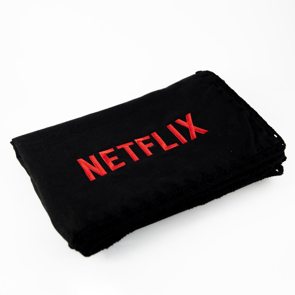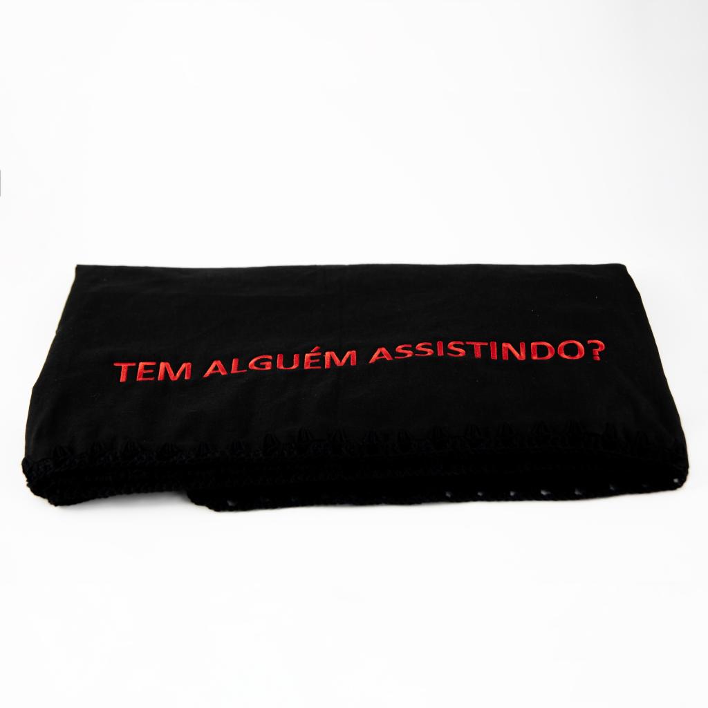 • Uma manta preta com a frase bordada em vermelho: “Tem alguém assistindo ainda?”
