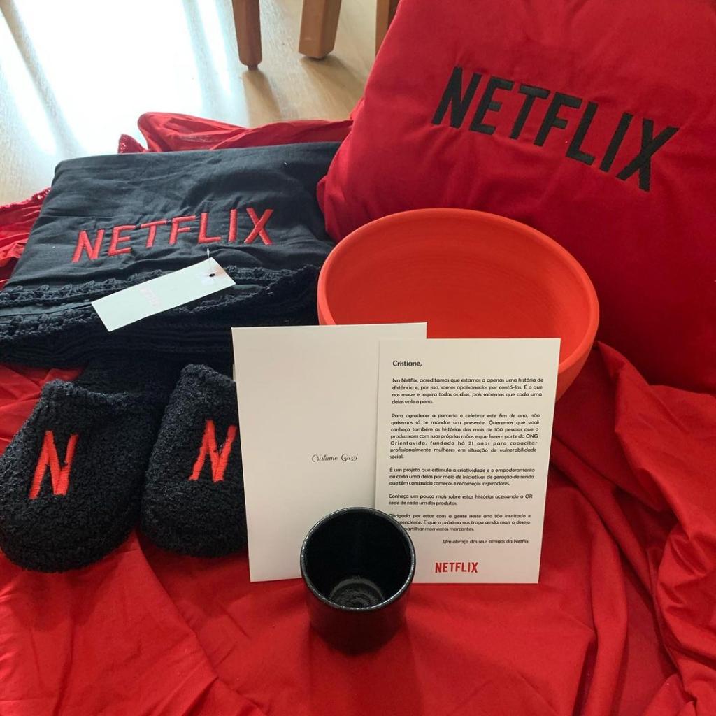 “Nós, da Netflix, sabemos contar histórias. E neste momento tão delicado da pandemia, queremos enviar a alguns parceiros um presente feito pela ONG Orientavida — algo especial para acompanhar nossas histórias.”