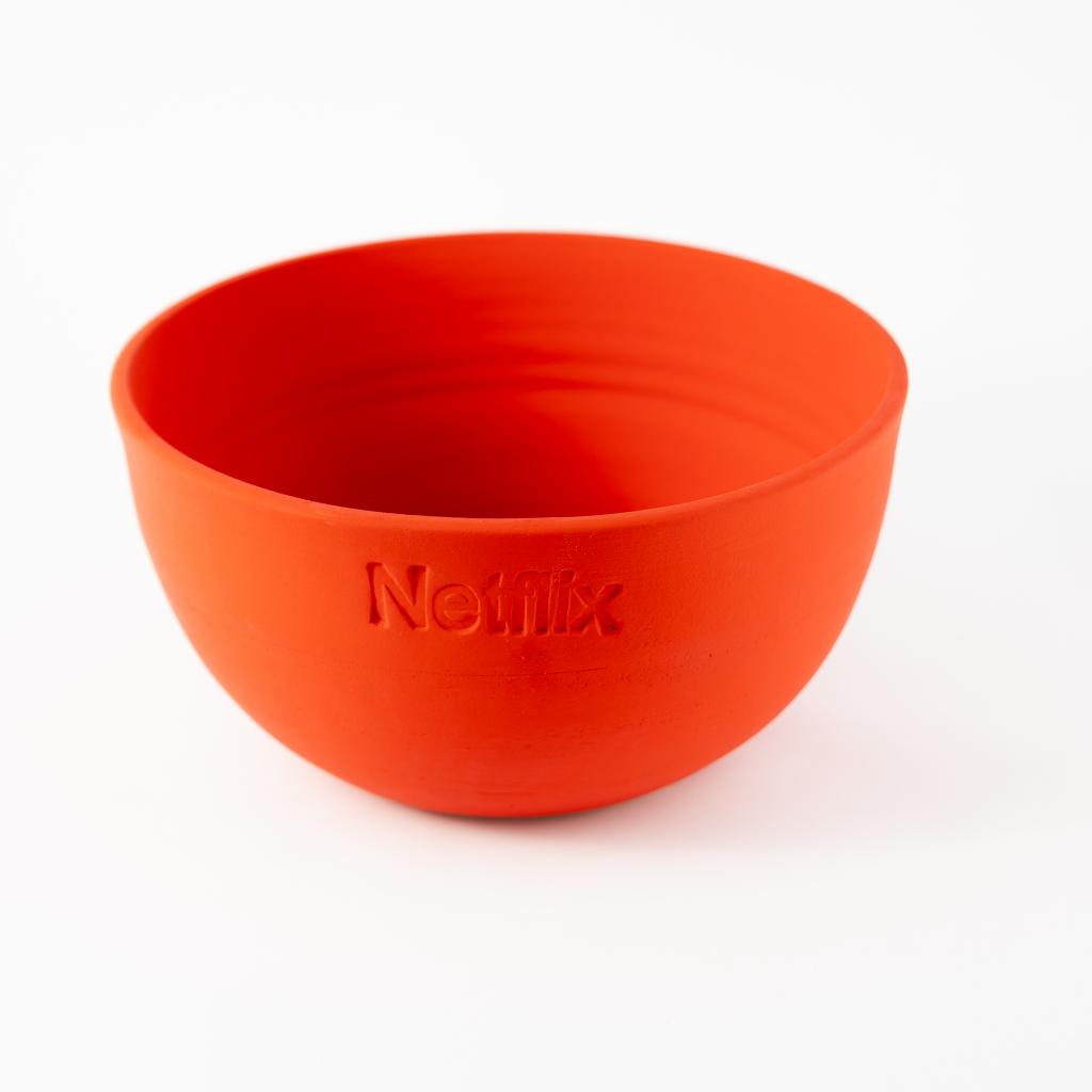 • Um bowl de cerâmica vermelho para pipoca;
