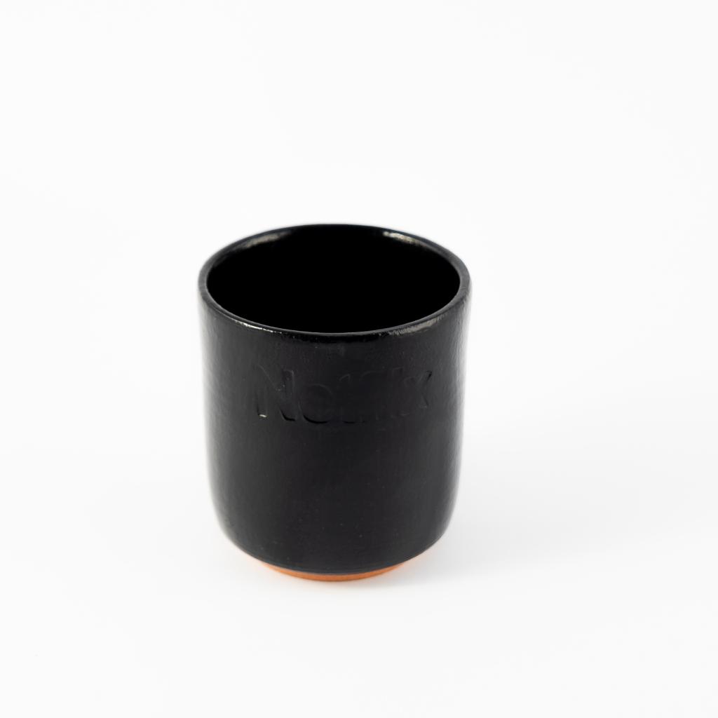 • Uma caneca preta de cerâmica para café;