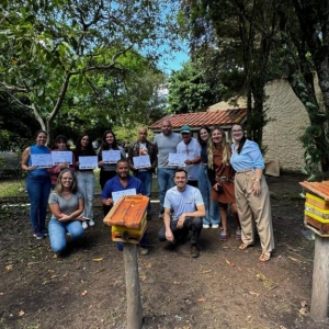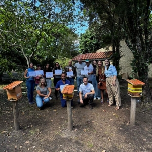 Entre os meses de março e abril, realizamos nosso primeiro curso de manejo de abelhas nativas sem ferrão, guiado pelo especialista Felipe Meireles (@sommelierdemel_felipemeireles) em parceria com a Bee2Be (www.bee2be.eco.br) e o apoio da EDP. Foram 10 pessoas formadas, entre membros da comunidade e da nossa própria equipe, prontas para se tornarem guardiãs desse patrimônio natural. Além disso, o Projeto BeeVolt, capacitou sete pessoas — incluindo quatro mulheres — na criação de abelhas sem ferrão, promovendo geração de renda, conservação ambiental e transformação social.